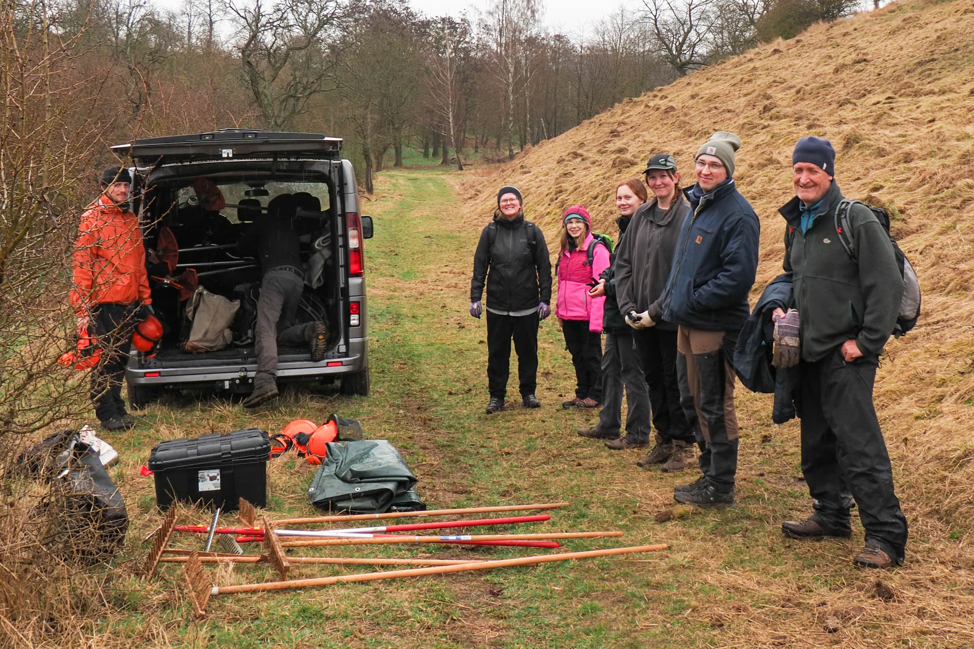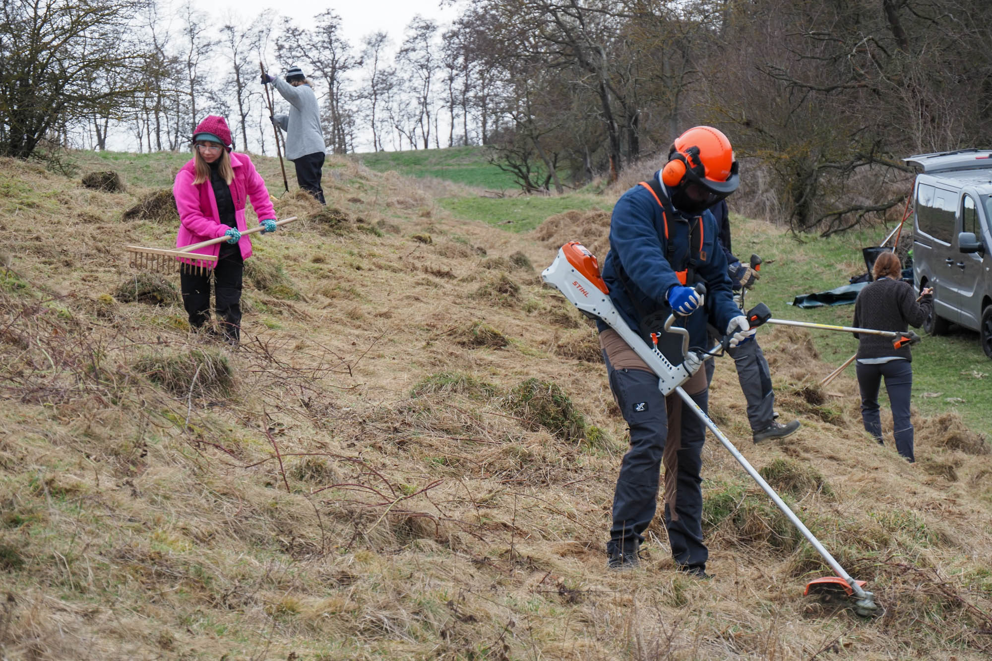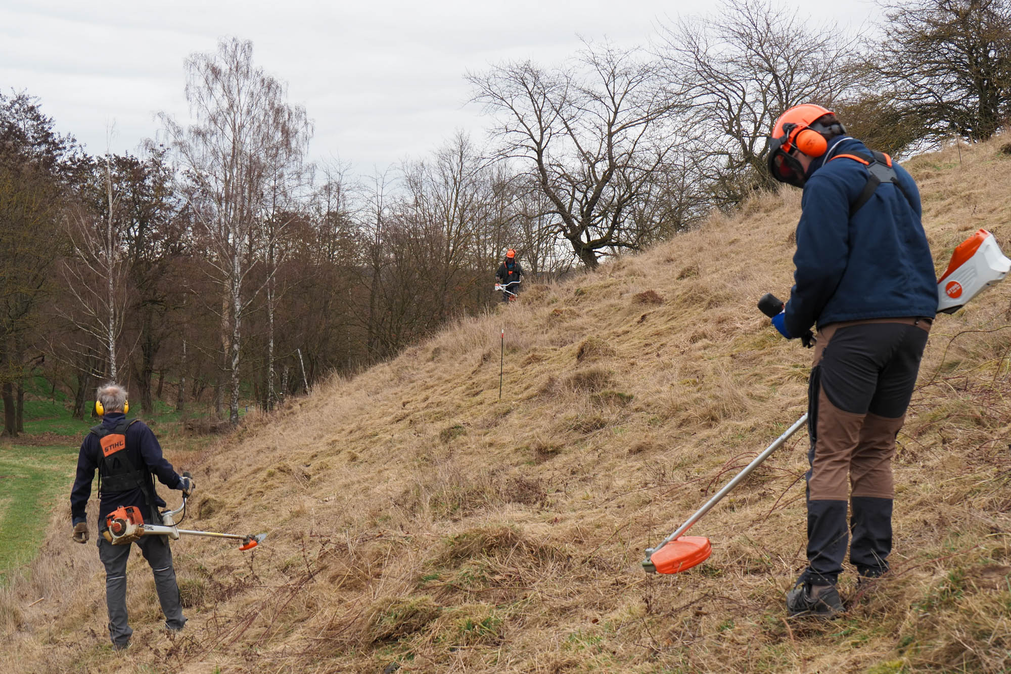 Durch die Initiative von Erik Welk gab es auch in diesem Jahr wieder einen Arbeitseinsatz im Stachelrodaer Tal. Am 14. 3. 2026 wurde eine Wiese am Nordhang des Tales mit Freischneidern gemäht und abgeharkt. Die Maßnahme soll die Entwicklungsbedingungen des zarten Feld-Enzians (Gentianella campestris) verbessern. 2025 wurden einige wenige Exemplare der Art an dieser Stelle beobachtet. Der NABU-Regionalverband Merseburg-Querfurt unterstützte den Einsatz mit der Bereitstellung von Arbeitsgeräten.